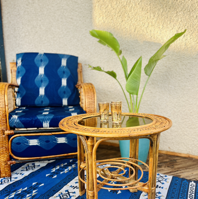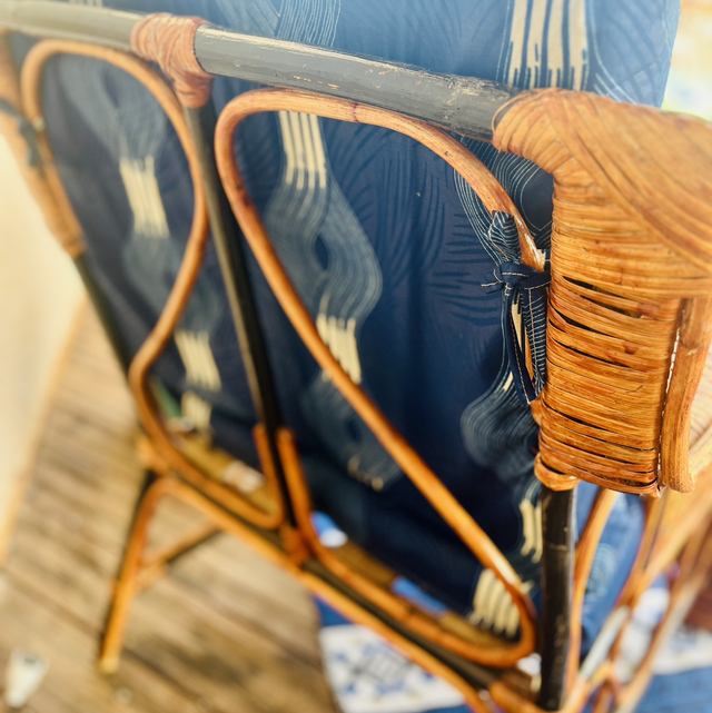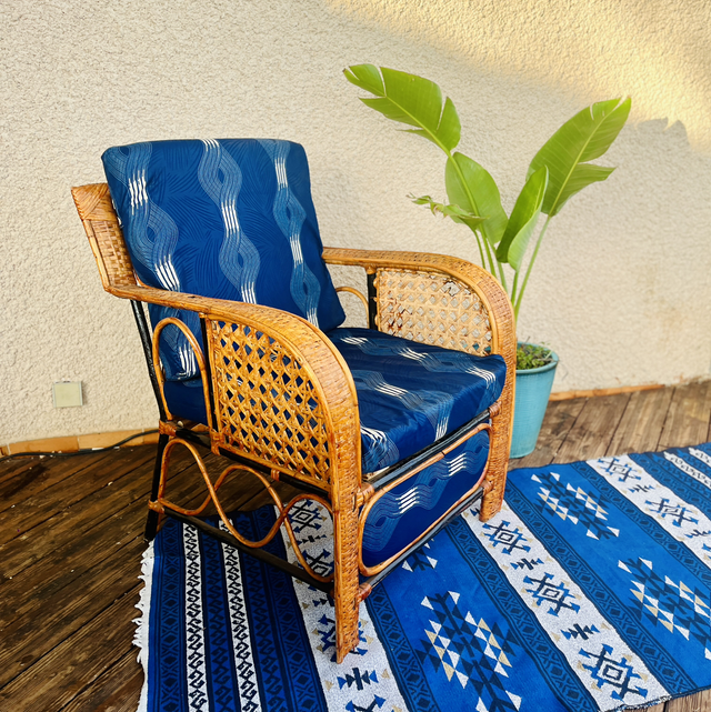 Fauteuil en rotin africain et coussin en wax bleu artisanal