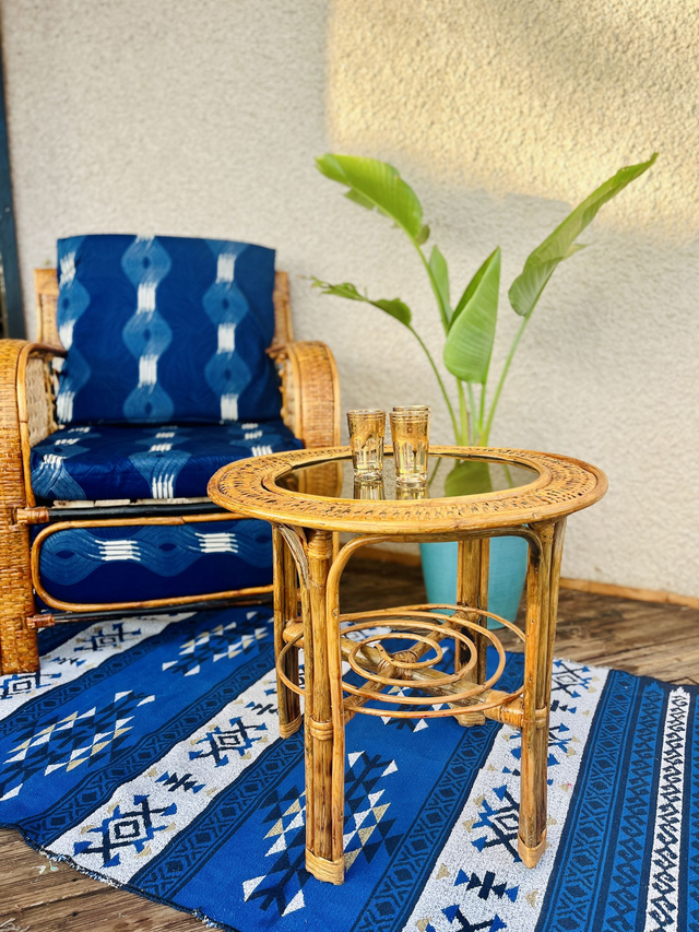 Table basse ronde en rotin avec plateau en verre. Modèle unique. Mobilier artisanal fabriqué en Guinée