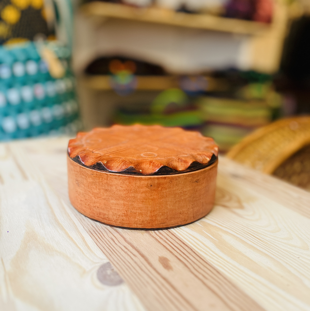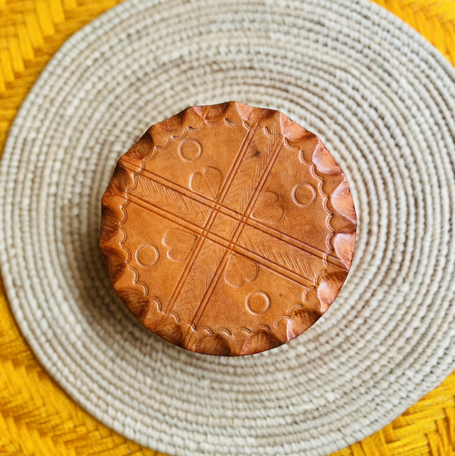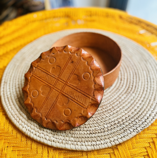 Boîte à bijoux en cuir de chèvre doux et inodore, réalisée à la main dans la pure tradition de l’artisanat africain.